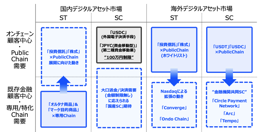 日本がやる意義として重要なのは、発展経路の違いです。海外では暗号資産で富を築いた層や銀行口座を持たないオフショアの投資家向けに、パブリックチェーン上でサービスが発展してきました。USDTやUSDCを使い、関連需要としてトークン化MMFやトークン化株式が出てきた。つまり、規制が緩いオンチェーン顧客向け市場から発展してきたのです。