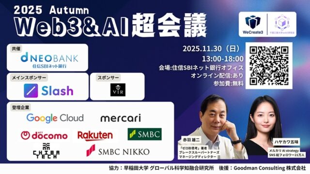 学生団体WeCreate3(代表:矢野大雅)および千葉工業大学web3研究会は、住信SBIネット銀行との共催のもと、無料イベント「Web3&AI超会議 2025 秋」を2025年11月30日(日)に住信SBIネット銀行本社(六本木・住友不動産六本木グランドタワー19F)にて開催します。