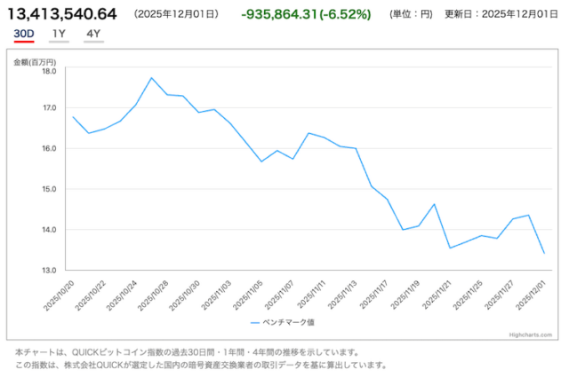 日本経済新聞グループの金融情報サービス会社QUICKは12月1日、国内で取引されるビットコイン(BTC)の円建て現物取引価格を示す「QUICKビットコイン指数」の本格的な算出・公表を開始した。
