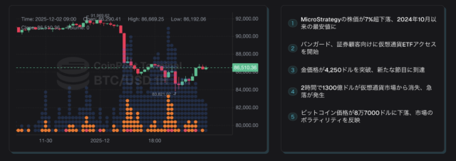 しかし、全体的なトレンドを俯瞰すると、ビットコインは10月中旬以降の下落基調から脱しきれていない。11月下旬の反発局面も結果的には一時的なものであり、下落トレンドの途上で見られる小反発、いわゆる「デッド・キャット・バウンス」に該当する可能性が高まっている。