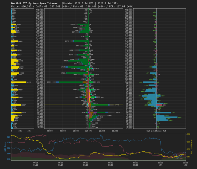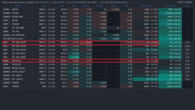 オプション市場に目を向けると、8万5,000ドルおよび8万ドルのプットポジションが下値のサポートとなっている一方、10万ドルのコールポジションが最大建玉となっている。市場参加者の中心的な見立ては、当面のレンジ相場での推移であると読み取れる。