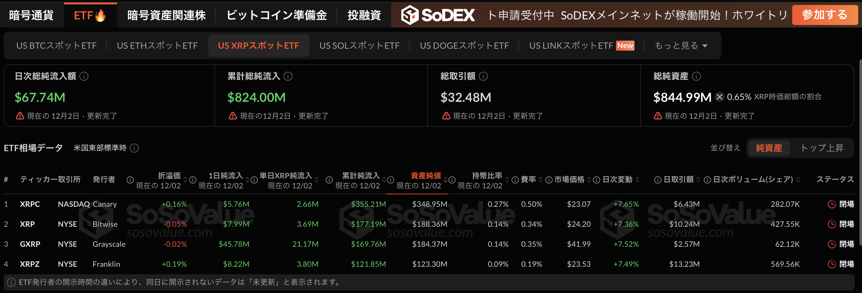 今回の流入データには、11月以降に上場したキャナリー・キャピタル、ビットワイズ、グレイスケール、フランクリン・テンプルトンの4社のXRP現物ETFが含まれている。12月1日には21シェアーズのTOXRも上場を発表した。
