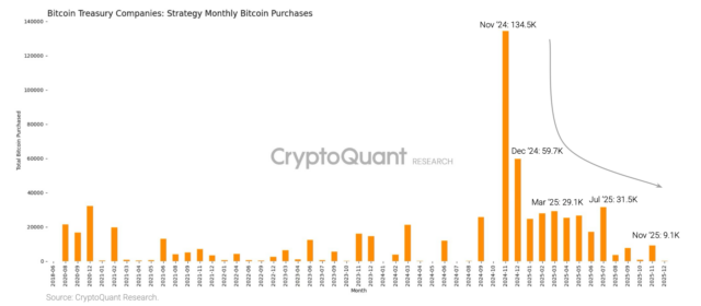 クリプトクアントによると、ストラテジーのビットコイン購入は2025年を通じて減速している。月間購入量は2024年11月の13.4万BTCから2025年11月の9,100BTCに減少。12月はこれまでに135BTCを購入している。同社の積極的なビットコイン蓄積から保守的で流動性重視の財務アプローチへの転換は、ビットコインの2025年相場トレンドと重なっている。