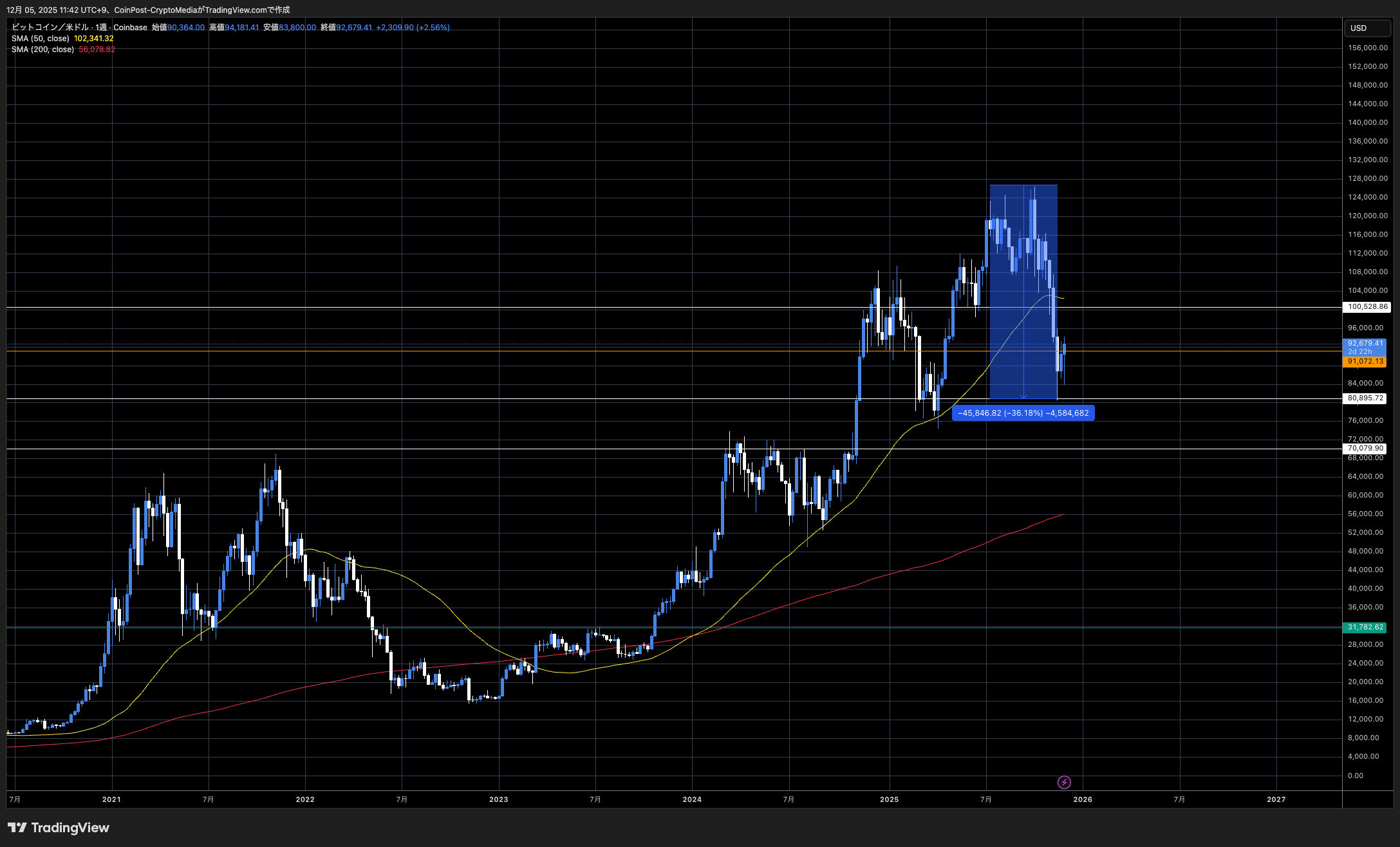11月17日には過去最高値の126,000ドルから36.2%急落して80,524ドルまで下落したが、その後は反発基調を見せている。
