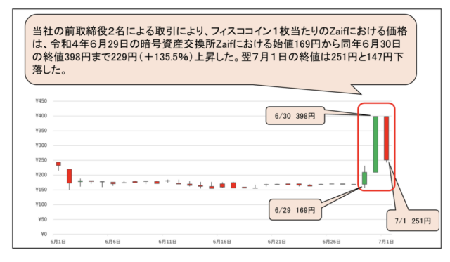 しかし2022年6月第2四半期末において、当該仮想通貨の処分見込価額が取得原価を上回ったことから、フィスコは取得原価を貸借対照表価額として計上した。だが処分見込価額の算定の基となった期末の終値398円は、前取締役2名による取引でつり上げられた価格であり、これを基に処分見込価額を算定することはできない。本来、フィスコは前取締役2名が取引を行う前の6月28日のザイフにおける終値169円を基に処分見込価額を算定し、取得原価との差額を仮想通貨評価損として計上すべきだったという。