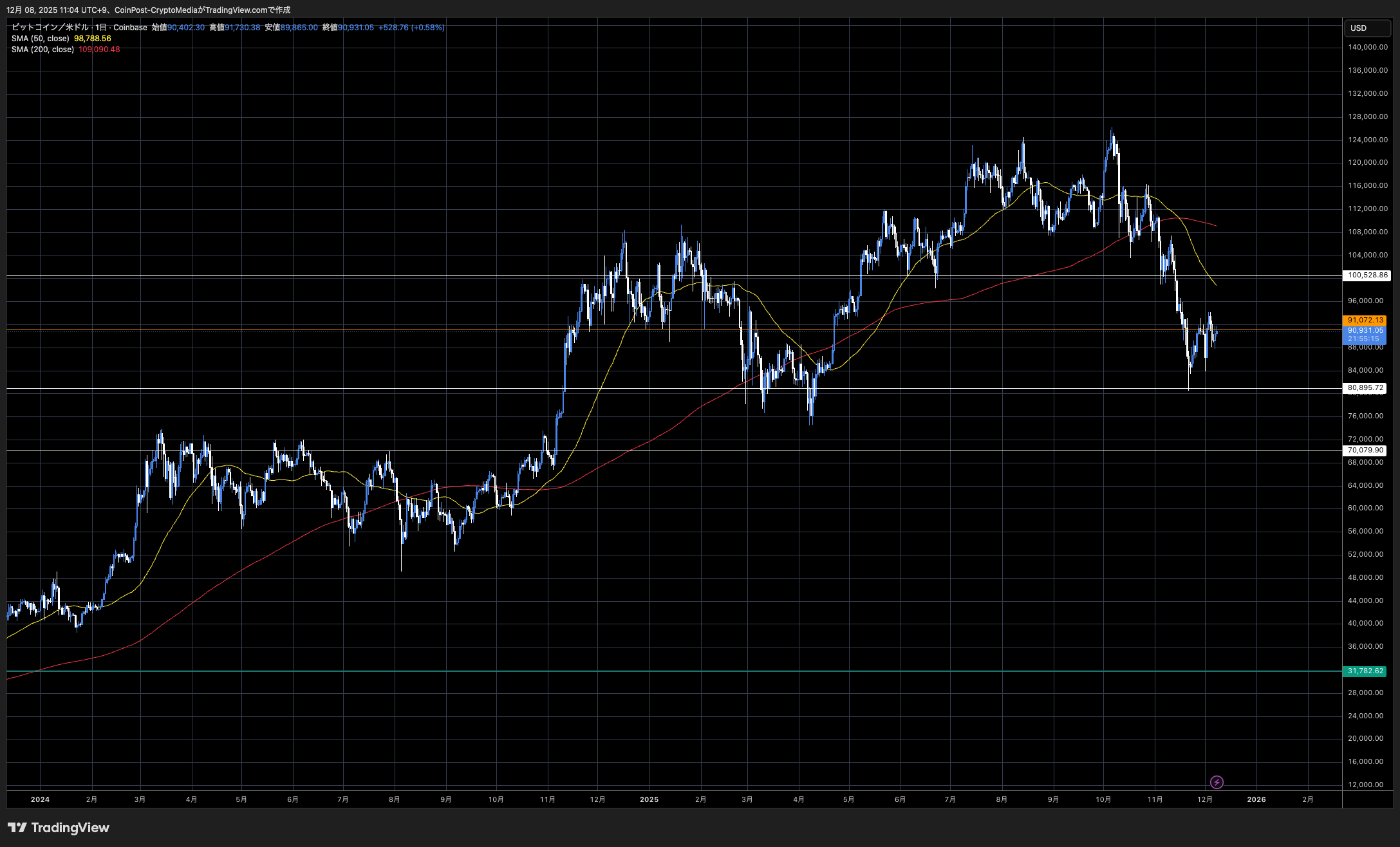暗号資産(仮想通貨)市場では、ビットコイン(BTC)は前日比+%の1BTC=90,977ドルに。