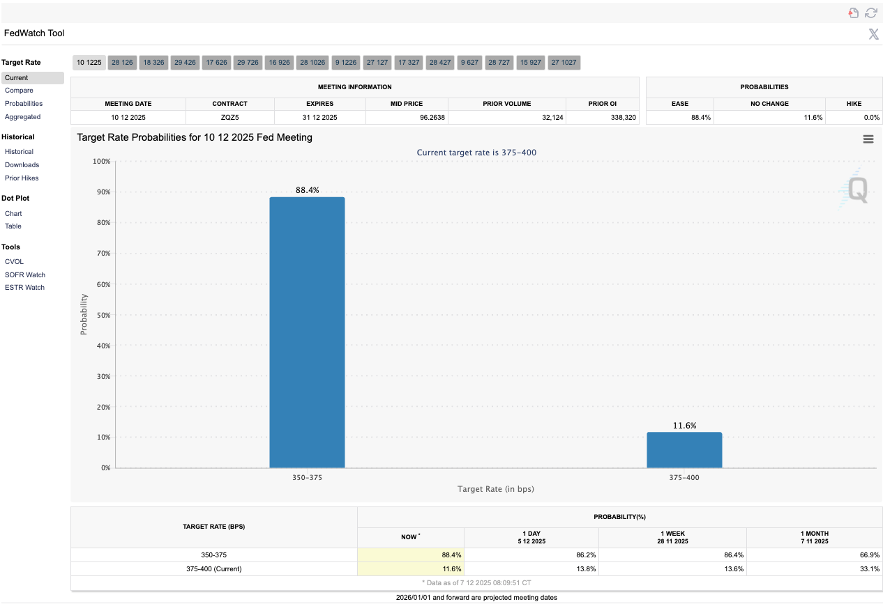 また、12月初旬以降の日本国債利回り上昇により、市場では円キャリートレードの巻き戻し観測が広がり、株式や暗号資産を含むリスク資産全体に売りが入りやすい環境が続いている。 今週のFOMC会合が焦点となる中、水曜日に開催される連邦公開市場委員会では、CMEグループのFedWatchツールのデータによると、市場は88.4%が0.25%の利下げを織り込んでいる。1ヶ月前は66.9%だった。