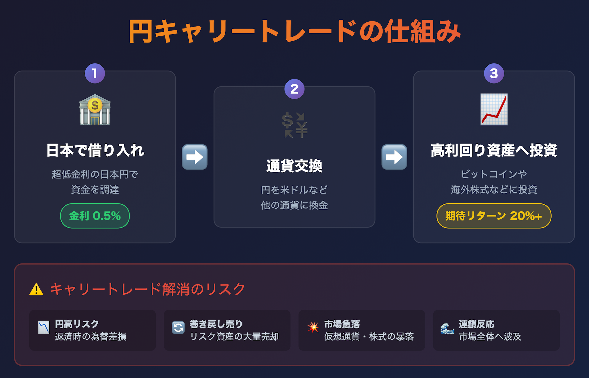 暗号資産(仮想通貨)市場への影響について、円キャリートレードの解消が大きなリスクになるとの指摘もある。