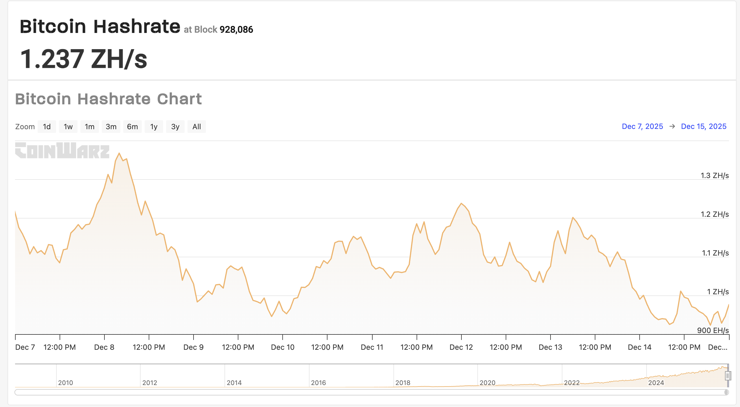 データプラットフォームCoinWarzによると、ビットコインのネットワークハッシュレートは12月7日時点で約1.2 ZH/s(ゼタハッシュ毎秒)だったが、15日には一時900 EH/s前後まで急落した。ただし、16日時点では1.237 ZH/sまで回復している。ハッシュレートの低下が新疆の施設停止と直接関係があるかどうかは確認されていない。