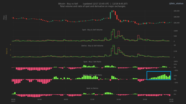 成行注文の動向を見ると、現物市場は概ねニュートラルな動きである一方、デリバティブ市場ではロングポジションが増加している(下画像青枠)。値ごろ感を背景とした打診的な買いが入っていると考えられる。