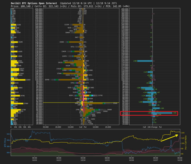 オプション市場では、プットポジションの増加を背景にPCR(プット・コール・レシオ)が上昇しており、市場参加者の投資家心理はかなり弱気に傾いている(下画像黄矢印)。直近では、7万ドル水準のポジション増加が目立つ動きとなっている(下画像赤枠)。