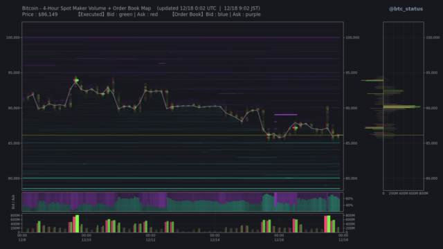オーダーブックの状況を見ると、急激な値動きの影響により板が薄くなっている。8万ドル水準にサポートが見られるものの、それ以外の価格帯では明確に支えるポジションが乏しく、価格が上下に振れやすい不安定な地合いとなっている。