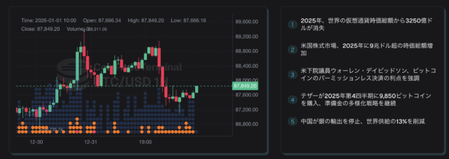 ビットコイン(BTC)は大晦日から年明けにかけて、直近24時間で最大35万円の下落となった。昨年内に現物を処分する動きが強まり、北米時間を中心に売りが優勢となった格好である。世界標準時(UTC)において、ビットコインの2025年は終値87,497ドルとなり、年始価格93,347ドルから▲5,850ドル(▲6.27%)の下落となった(コインベース基準)。