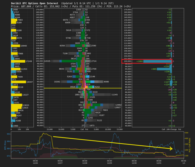 オプション市場では、コールポジションの増加を背景にPCR(プット・コール・レシオ)が低下しており、市場参加者の投資家心理は強気に傾いている(下画像黄矢印)。直近では、10万ドル水準のポジション増加が目立っており、上値を意識したポジション構築が進んでいる状況である(下画像赤枠)。