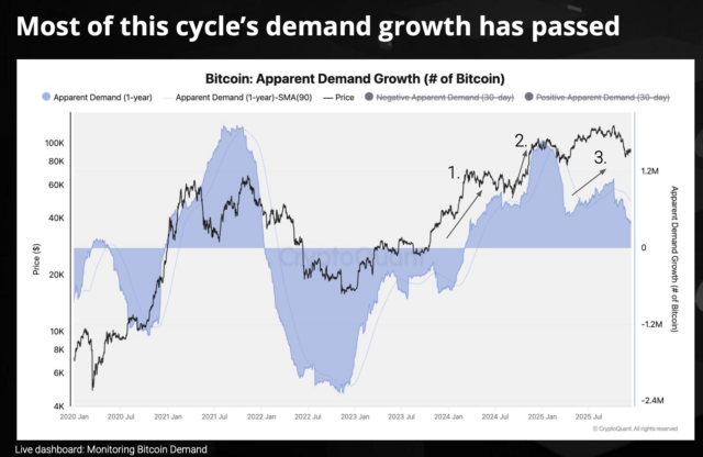 仮想通貨オンチェーン分析企業のクリプトクアントは今週、ビットコイン(BTC)の需要成長が明確に鈍化し、弱気相場への移行を示していると分析した。同社のレポートによると、2023年以降に見られた3つの主要な需要拡大の波が終息し、10月上旬から需要成長がトレンドを下回る状態が続いている。