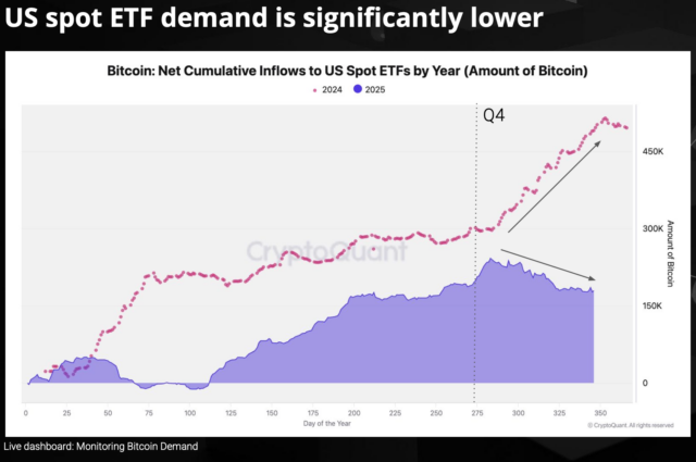 機関投資家と大口保有者の需要が縮小に転じている。米国のビットコイン現物ETFは2025年第4四半期に約24,000BTCの純売却を記録し、前年同期の強い買い越しから一転した。100から1,000BTCを保有するアドレスの成長率もトレンドを下回っており、2022年の弱気相場前に見られた状況と類似している。