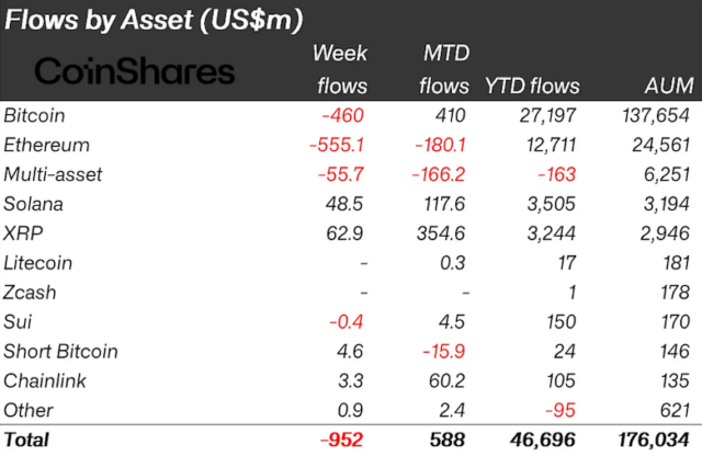 デジタル資産投資商品への資金フローを原資産別に見たデータは以下の表の通りで、最も資金が純流出したのはイーサリアム(ETH)の投資商品だった。