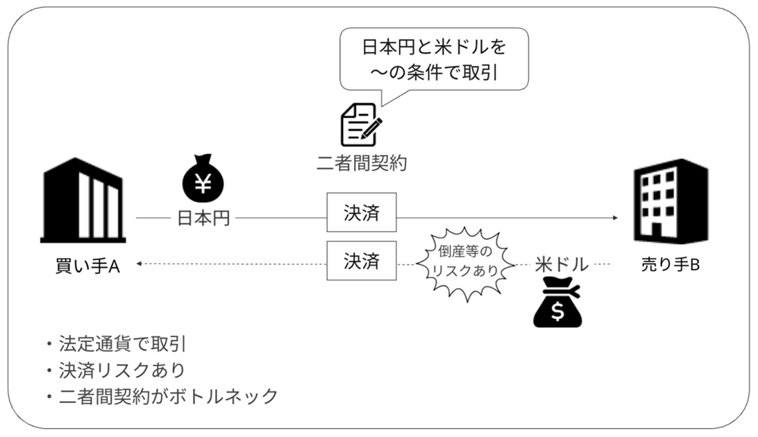 従来の二者間契約では、取引条件や与信枠を事前に定めることで決済リスク(受渡通貨を受け取れない場合に損失を被るリスク)を抑えようとします。しかし、相手が約束通りに支払うかどうかは、最終的に「信用」に依存します。