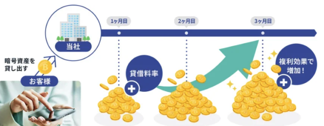 レンディングとは、保有する暗号資産をサービス事業者に貸し出し、貸出期間に応じた貸借料を得る仕組み。同サービスでは、運用実績を持つ複数の提携先と分散運用を行い、その運用益から貸借料を支払う。