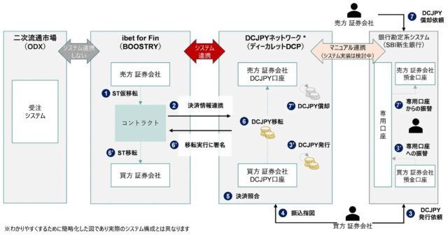 SBI証券、大和証券、SBI新生銀行、BOOSTRY、大阪デジタルエクスチェンジ(ODX)、ディーカレットDCPの6社は26日、セキュリティトークン(ST)の二次流通市場の発展に向けて、トークン化預金DCJPYを利用したSTのDVP決済の実証に関する協業を開始したと発表した。