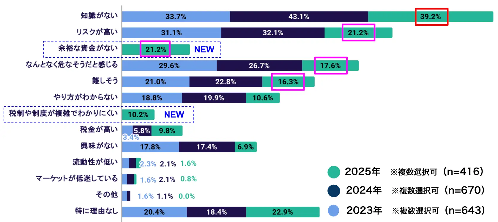 仮想通貨に投資していない理由としては、「知識がないため」が39.2%で最多となった。ただし前年から3.9ポイント低下しており、理解や受容が進みつつある様子がうかがえる。