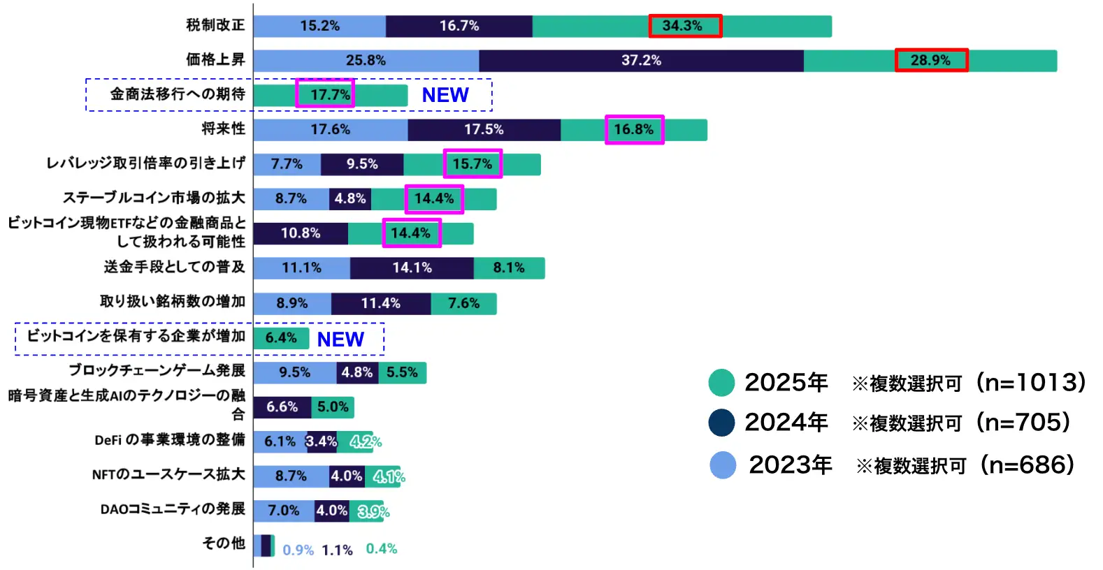 調査結果によると、2026年の仮想通貨市場への期待として「仮想通貨の税制改正」が34.3%で最多となり、前年まで最も多かった「価格上昇」を上回った。