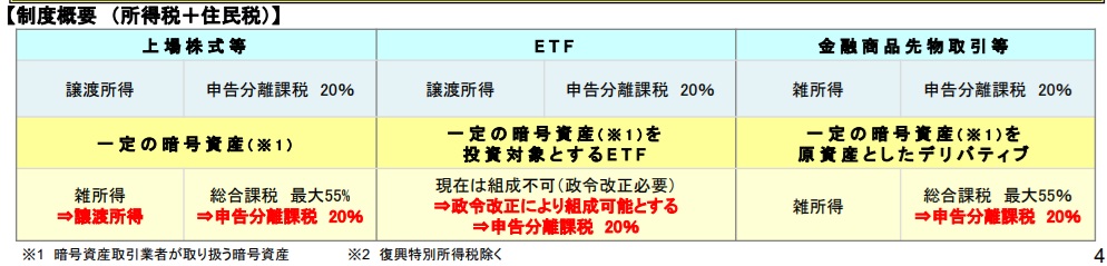 また、一部の暗号資産についてはETF(上場投資信託)で取り扱うことも可能にする。このためには、政令改正が必要となる。実現すれば、暗号資産ETFについても申告分離課税で税率20%という扱いとなる見込みだ。
