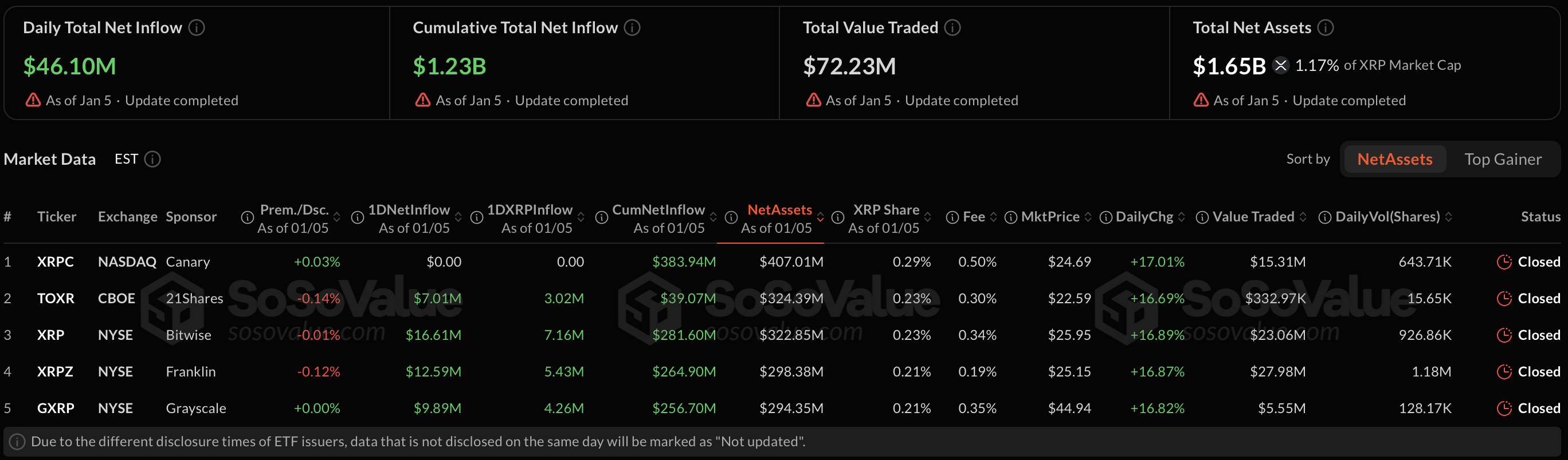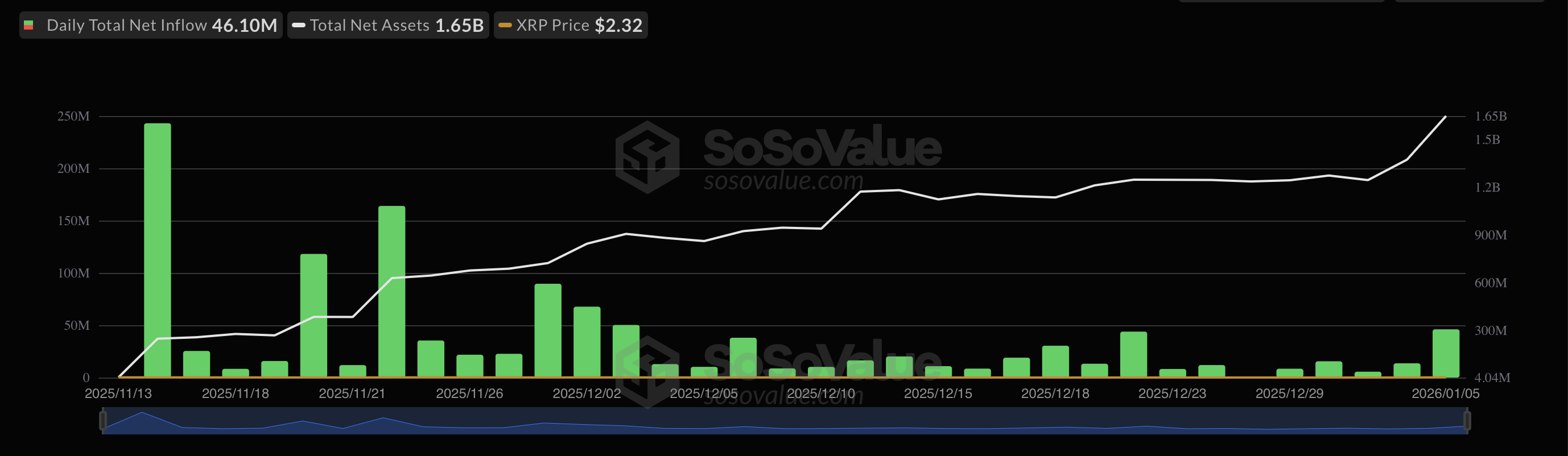 SoSoValueの最新データによると、米国で上場しているXRP現物ETFは1月5日時点で累計純流入額が12.3億ドル(約1800億円)に達した。単日純流入額は4610万ドル、単日総取引額は7215万ドルを記録している。