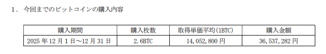 12月の取得単価は1BTC当たり約1,405万円で、累計の平均取得単価は約1,626万円となっている。同社は2025年7月より総投資枠8億円の範囲内でビットコイン購入を開始しており、毎営業日200万円相当の定期購入によるドルコスト平均法で価格変動リスクを分散している。