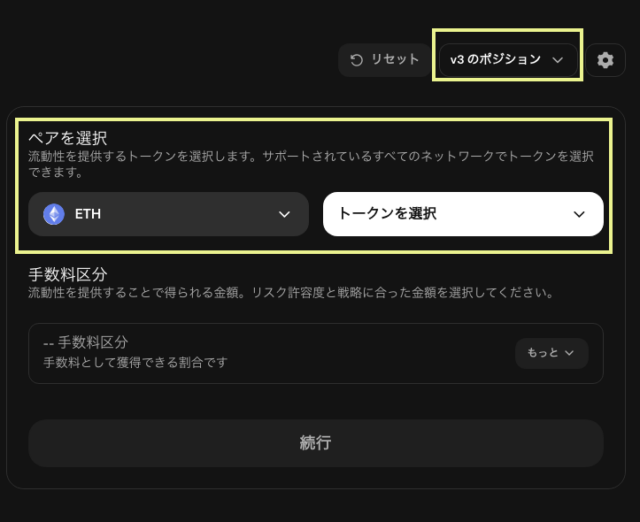 「v3のポジション」であることを確認し、ペアを選択します。初心者の場合は、取引量が多く、実績のあるペアを選ぶ方が無難です。