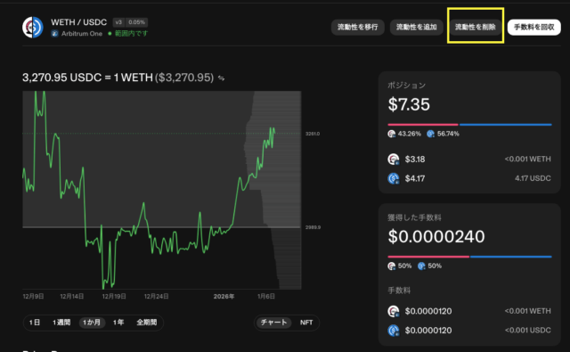 - トークン価格が設定範囲の外へ動くと、ポジションは範囲外となり、片方のトークンだけの状態になり、その間は手数料が発生しなくなります。