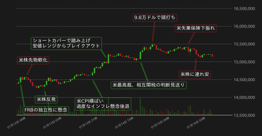 これによって、BTC円は12月の高値(1500万円)を回復し、底入れの機運が高まると、14日には米最高裁がトランプ米政権による相互関税の違法性判断を見送ったことも支援材料となり、1550万円近辺まで一段と水準を戻した。