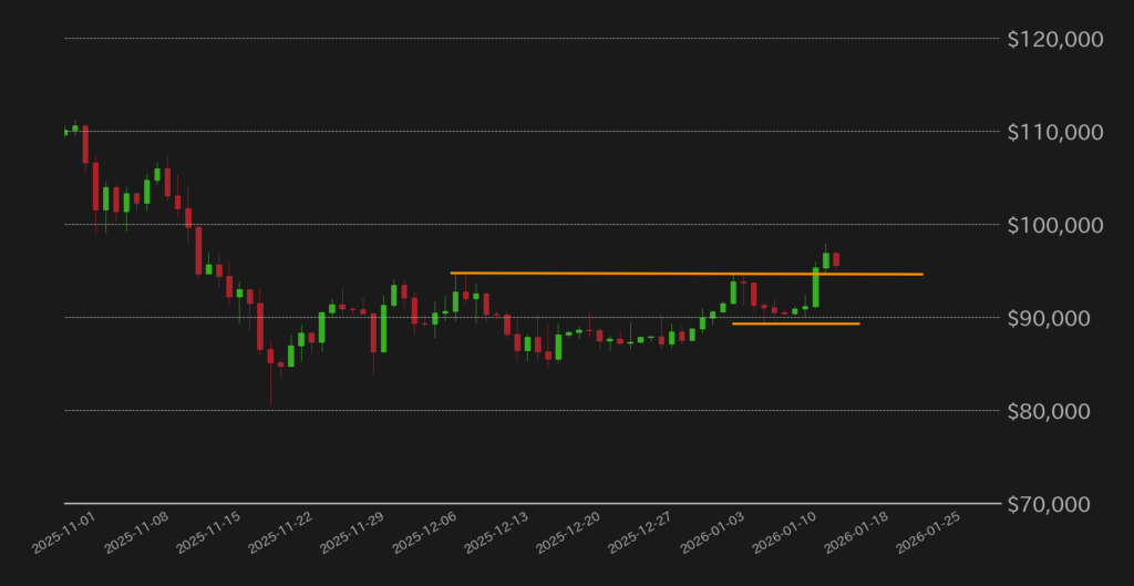 足元では、100日移動平均線や、史上最高値と11月安値を基点とするフィボナッチ・リトレースメント38.2%戻りなどが密集する9.7万ドル〜9.8万ドルエリア(約1539万円〜1554万円)がレジスタンスとなっている。