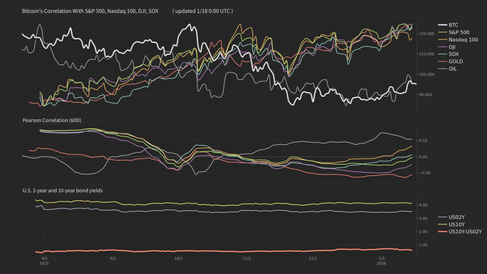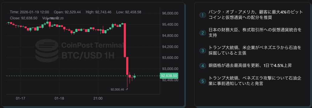 ビットコイン(BTC)は年始以降、上昇基調を維持していたものの、トランプ米大統領がグリーンランドを巡り欧州8カ国に追加関税を課すと発表したことを受け、株式市場とともに急落した。