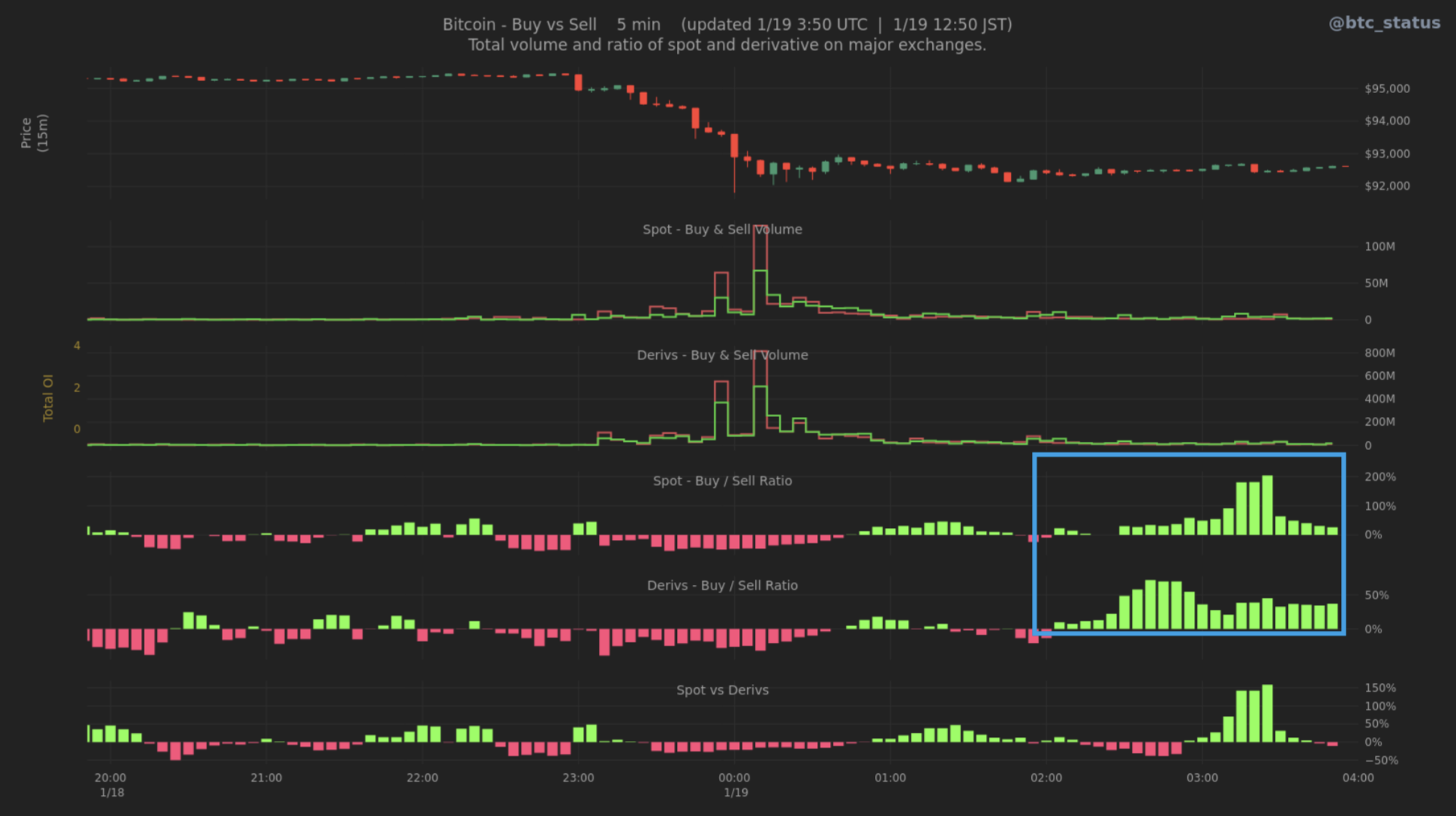 成行注文の動向を確認すると、急落後は現物市場・デリバティブ市場ともに買いが顕著となっており、下落を押し目として拾う動きが強まった格好である(下画像青枠)。