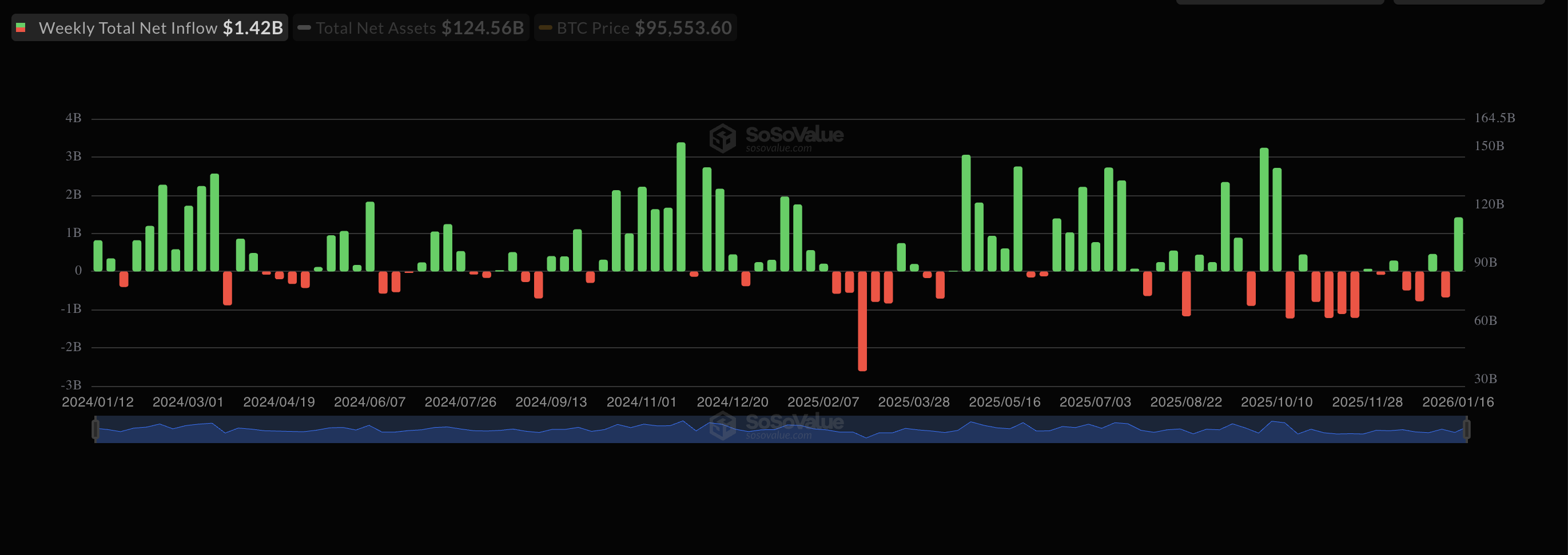 SoSoValueのデータによると、米国の現物ビットコイン(BTC)上場投資信託(ETF)は先週、14.2億ドル(約2,100億円)の週間純流入を記録し、10月初旬以来の最高水準となった。