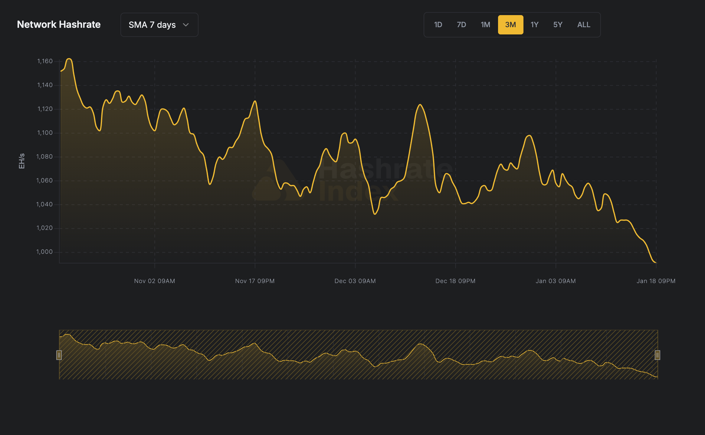 仮想通貨データプロバイダーHashrate Indexのデータによると、ビットコイン(BTC)のハッシュレートが1月18日に991 EH/s(7日間移動平均)まで低下し、昨年9月中旬以来約4カ月ぶりに1ゼタハッシュ(ZH/s)を下回った。10月19日のピーク時には1,157 EH/sを記録していたが、それ以降約15%下落している。