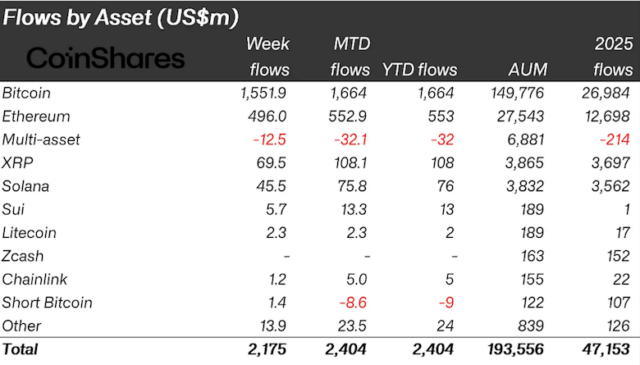 デジタル資産投資商品への資金フローを原資産別に見たデータは以下の表の通り。ビットコイン(BTC)の投資商品への純流入額が約15.5億ドル(約2,450億円)と最も多かったことが示されている。