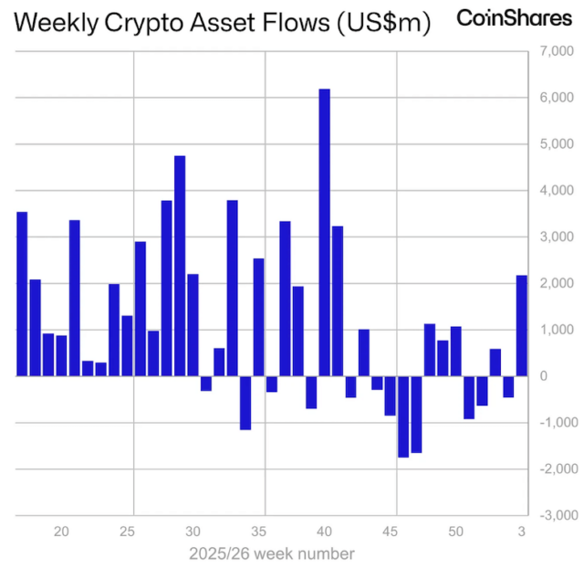 暗号資産(仮想通貨)投資企業CoinSharesでリサーチ部門のトップを務めるジェームズ・バターフィル氏は19日、ETFなどのデジタル資産投資商品全体の先週における資金フローは、21.7億ドル(約3,430億円)の純流入だったと報告した。