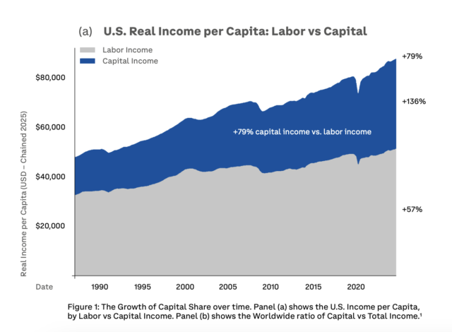 コインベース研究所は1月19日、資本所得と労働所得の格差拡大に関する報告書を公表した。過去40年で米国の労働所得が57%増加した一方、資本所得は136%急増したと指摘している。コインベースのアームストロングCEOがXで紹介した。