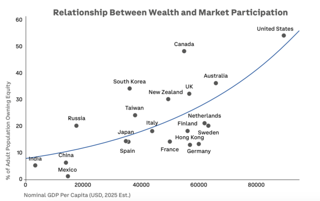 報告書によると、世界で約40億人の成人が株式・債券市場へのアクセスを持たない。米国では上位10%の世帯の96%が株式を保有する一方、下位20%では17%にとどまる。新興国では株式保有率が一桁台にとどまることも多い。