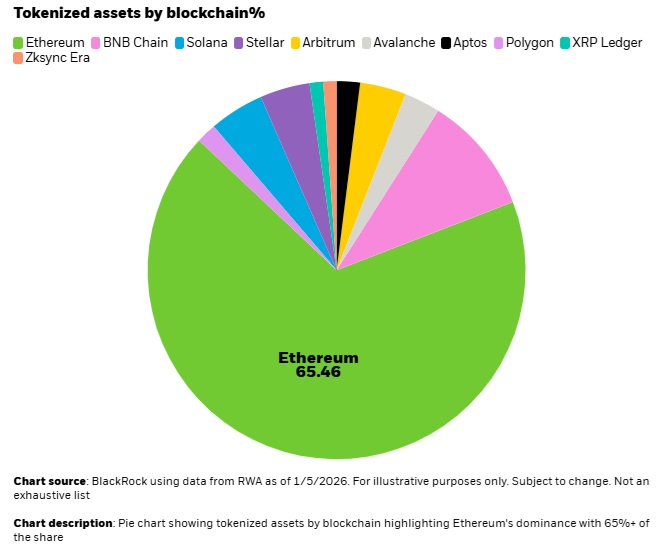また、今月5日時点でトークン化資産の約65%が暗号資産(仮想通貨)イーサリアム(ETH)のチェーン上で発行されているとのグラフも示した。なお、BNBチェーンが約10%、ソラナ(SOL)が約5%と続いている。
