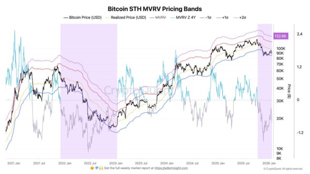 短期保有者のSOPR(支出アウトプット利益率)指標は、売却価格と購入価格の比率を示し、1.0を上回れば利益、下回れば損失での売却を意味する。SMA7日は0.996と1.0を持続的に下回っている。前日の安値8万7,500ドルでSOPRは0.965まで低下し、平均的な短期保有者の取引で約3.5%の損失に相当した。現在の8万9,000ドルから9万ドルへの回復は1.0水準を下から試す動きとなっているという。