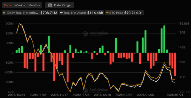 米国の暗号資産(仮想通貨)ビットコイン(BTC)の現物ETFは21日、約7億ドル(約1,123億円)の資金が純流出した。