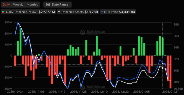 また、この日のイーサリアム(ETH)の現物ETFは、約3億ドル(約471億円)の資金が純流出。ビットコインと同期間に当てはめると、以下のグラフの通り、イーサリアムの現物ETFも1日の純流出額として最大規模となっている。