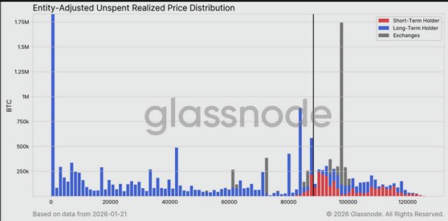 直近のラリーで93,000~98,000ドルの供給分布は埋まったが、これは高値圏で購入した投資家から新規市場参加者への再分配によるもので、新たな「短期保有者の壁」を作っている。10万ドル超には、依然として大量の「売り待ち在庫」(供給オーバーハング)があり、持続的な売り圧力の源泉となっている。
