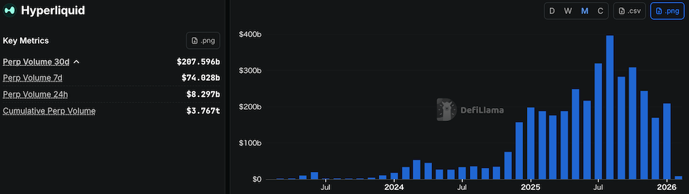 DefiLlamaによると、2025年10月にPerpDEX全体で過去最高となる1.3兆ドルを超える月間取引量を記録しました。2024年同月の1,400億ドルと比較すると、わずか1年で約9倍の取引量増加となっており、PerpDEXの規模が急拡大していることがわかります。