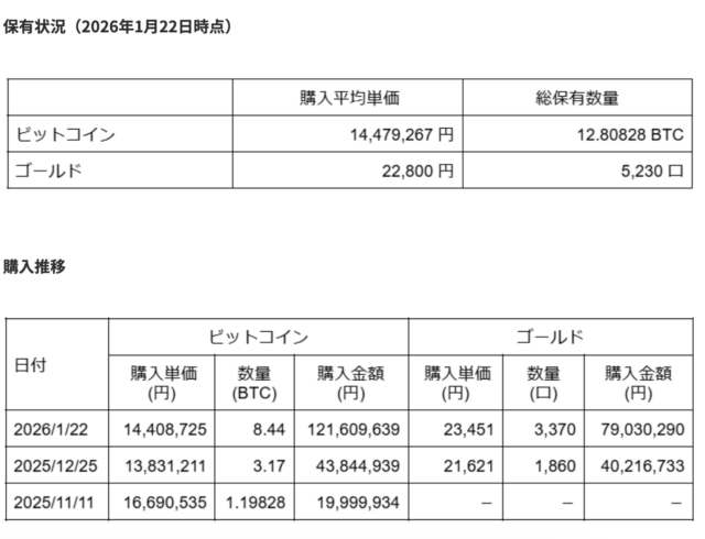 今回の購入内容は、ビットコインが8.44BTC、ゴールドが3370口となっている。22日時点での同社の総保有量は、ビットコインが12.80828BTC、ゴールドが5230口達した。