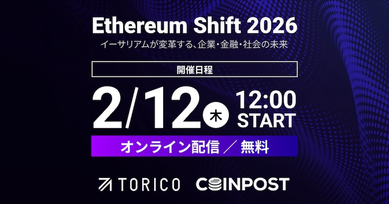 株式会社CoinPost(本社:東京都千代田区、代表取締役:各務貴仁、以下「CoinPost」)は、株式会社TORICO(本社:東京都千代田区、代表取締役社長:安藤拓郎、以下「TORICO」)と共催で開催するオンラインイベント「Ethereum Shift 2026」について、TORICOがイベント特設サイトを公開したことをお知らせいたします。