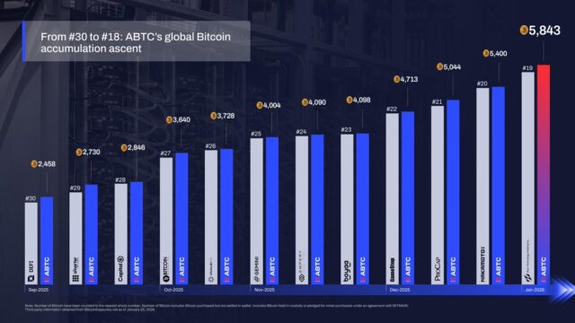 ナスダック上場の暗号資産(仮想通貨)マイニング企業アメリカン・ビットコインは1月25日時点でビットコイン保有量が約5,843BTCに達したと発表した。新たに416BTCを追加購入したという。